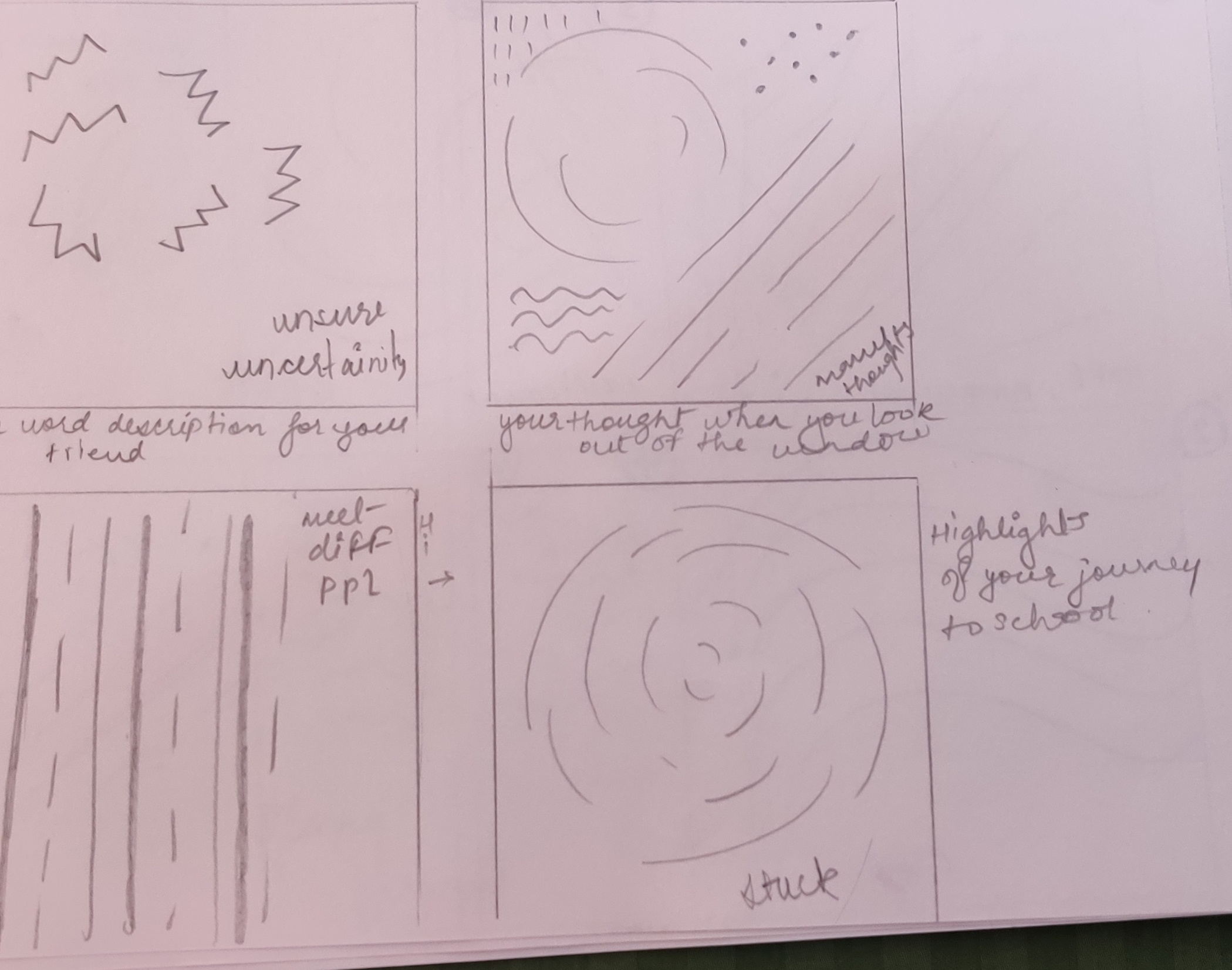 SELF REFLECTION :While doing this exercise in class, I had lot of difficulty expressing the given topics in class through just only lines and dots, as whatever I used sketch ultimately took up a shape and form.Its then when I understood how necessary it is to think out of the box and express those emotions given in the topic and not the literal meaning through lines and dots . Post the excercise I could now express emotions through lines and dots meaningfuly.