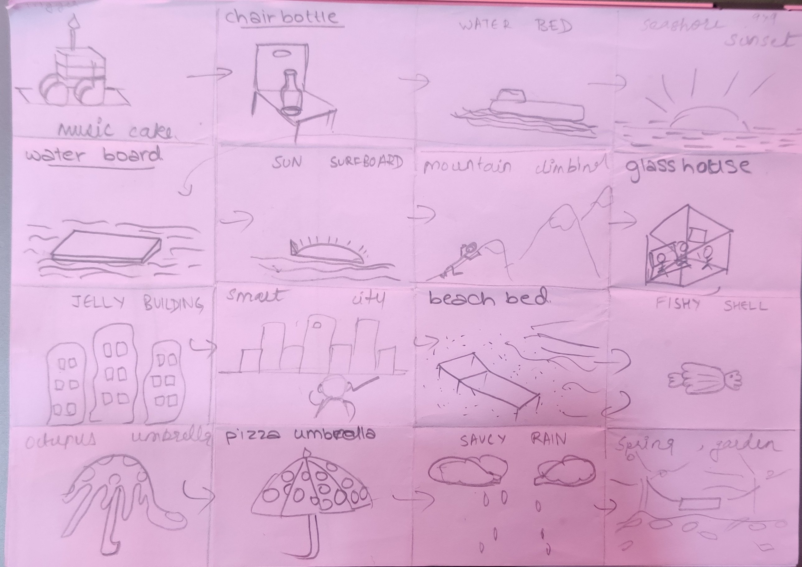 CLASS DISCUSSION AND ACTIVITY :The activity was called trigger or 9×9 , in which, in teams of 4 each one will make 16 boxes on a sheet , within Every minute each one had to draw any two objects ,or draw a combination of two objects in one box ,and pass on the sheet clockwise, the next person will draw whatever comes to his/ her mind seeing the first box , if he or she couldn’t think of anything then they could draw another set of two words and so on. This sheet had to be circulated until all the 16 boxes fill up and the sheet must go to the person who started in the first place.