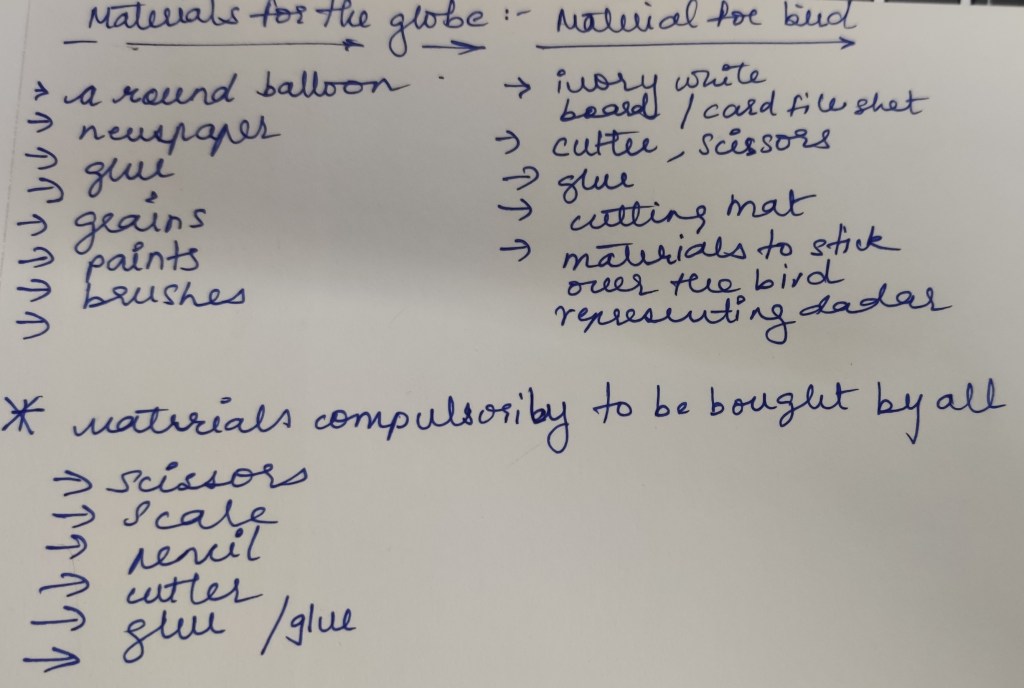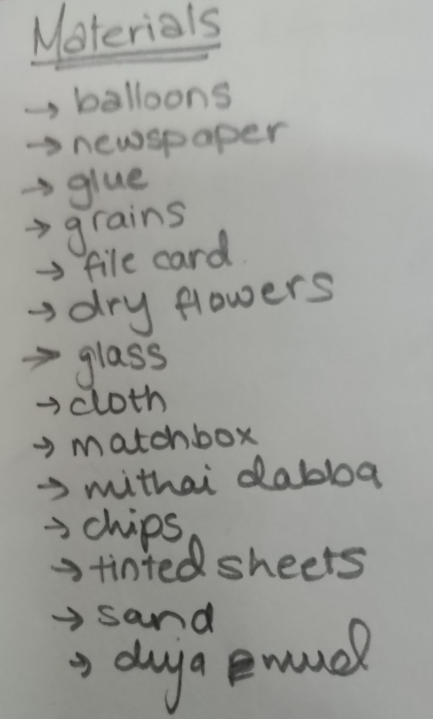 We then came to a conclusion and decided to go further with it, we were further working on listing all the materials we need for the same and , started collecting them, while few were getting the ideas crosschecked with maam and the rest were working on the basic drawing and cutting to make the installation or model.