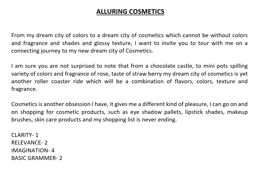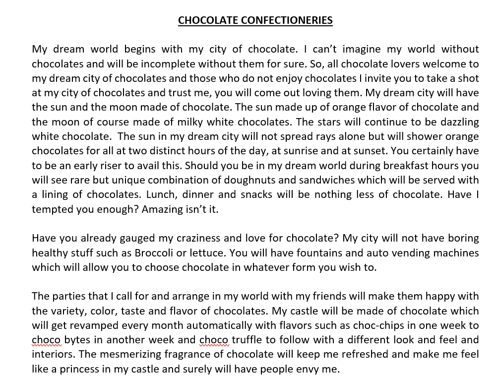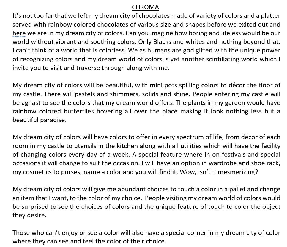 The review I got for my stories was that both my stories had a lot of repetition of the statement ‘ my dream city or ,my dream city of chocolate, or my dream city of colour’s in every paragraph, which gave a sense of excess repetition which she advised me to change and I completely felt it justified and she graded me 9/10.